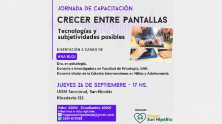 El jueves 26 de septiembre a las 17:00 hs se realizará una Jornada de capacitación: “CRECER ENTRE PANTALLAS. Tecnologías y subjetividades posibles”, a cargo de la Dra. en psicología Ana Bloj.