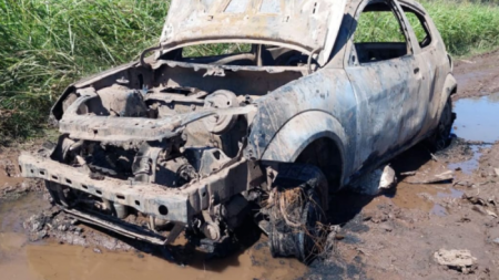 La víctima quedó empantanada con su vehículo en calle Tierra del Fuego. Cuando regresó a buscarlo al día siguiente comprobó que se encontraba incendiado, con destrucción total.