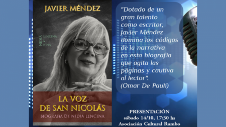 El sábado 14 de octubre, el escritor Javier Méndez presentará el libro “La voz de San Nicolás. Biografía de Nidia Lencina”. El acto tendrá lugar en la Asociación Cultural Rumbo de San Nicolás , en 9 de Julio 80, a las 17:30 hs.