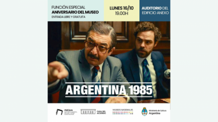 En una función especial por el aniversario del Museo Nacional Casa del Acuerdo, el lunes 16 de octubre a las 19h se proyectará en el Auditorio del Edificio Anexo (De la Nación 139), la película "Argentina, 1985".
