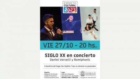 El Colegio de Escribanos de San Nicolás presenta "Siglo XX en concierto", Daniel Vercelli y Romiphonic. Este acto cultural se realizará el viernes 27/10 a las 20 hs a beneficio del Hogar San Hipólito en la Delegación San Nicolás.