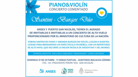 El Puerto de San Nicolás y ANSES invitan a un concierto de piano y violín para el próximo domingo. El encuentro tendrá lugar a las 17h en el auditorio “Macacha Güemes” del Instituto Tecnológico (ITEC).