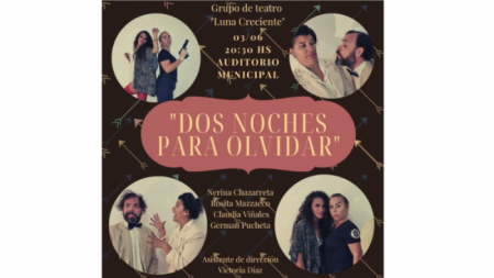El viernes 3 de junio a las 20:30hs, se presentará en el Auditorio Municipal (Maipú 22), la obra “Dos noches para olvidar”, a cargo del grupo de teatro Luna creciente, con dirección de Claudia Viñales.