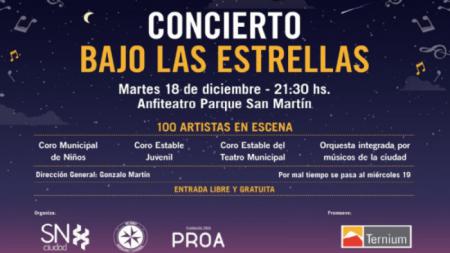 Cerrando el 2018, el martes 18 de diciembre a las 21.30 hs. tendrá lugar en el Anfiteatro del Parque San Martín el “Concierto bajo las estrellas”, promovido por Ternium. Habrá 100 artistas en escena Dirección de Gonzalo Martín.