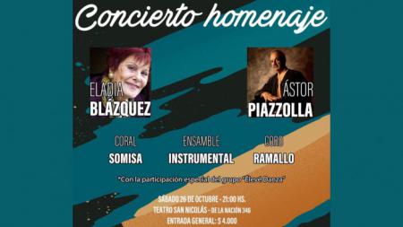 El próximo sábado 26 de octubre a las 21:00 hs en las instalaciones del Teatro Municipal Rafael de Aguiar, el coro realizará un concierto HOMENAJE A ASTOR PIAZZOLLA Y ELADIA BLÁZQUEZ.